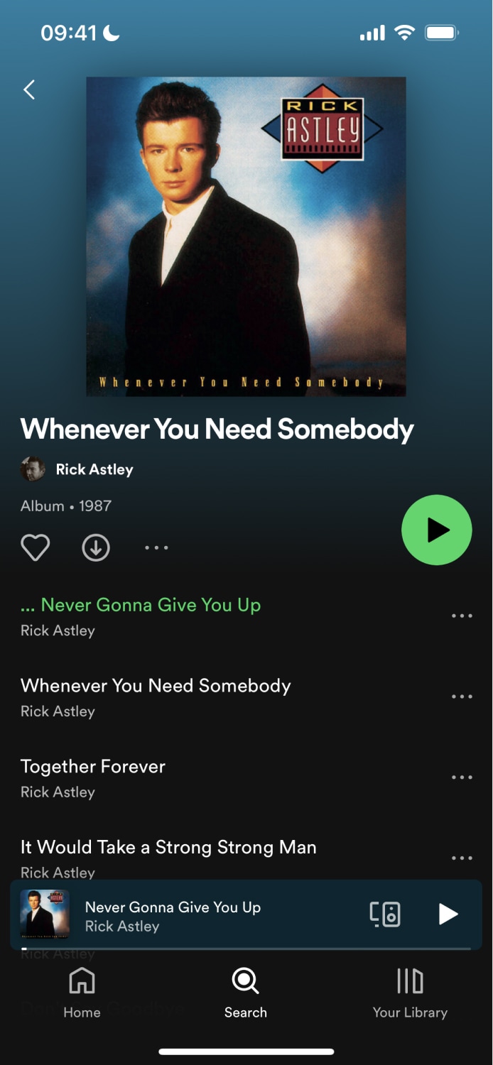 The example below shows how the Spotify app reuses the same album component to show content in multiple tabs. Notice that each screenshot shows the same album but from a different tab.